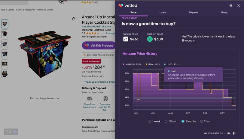This is where things get interesting. According to the data points, throughout June and July, this arcade cabinet used to sell for $699 USD. That is a lot of money. However, as time has progressed, the price has steadily dropped from $699 to $499 to $399 on November 10th, all the way down to the lowest price ever at $284.99 today.