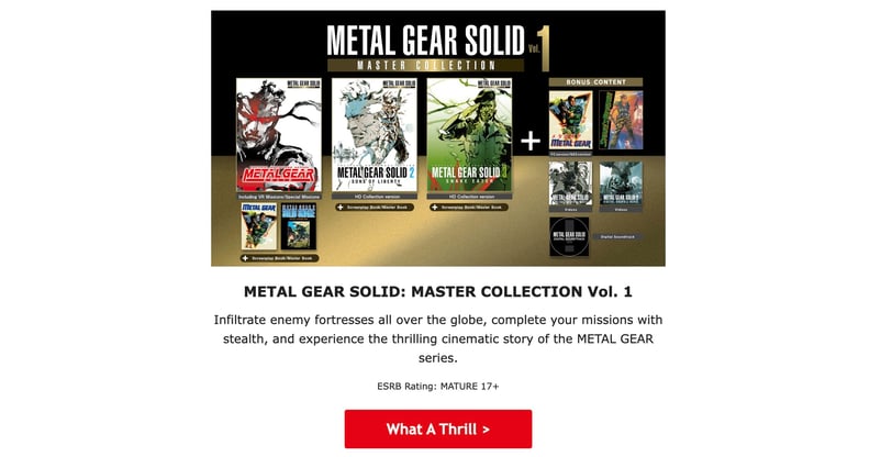 Take, for example, this small insert promoting the new Metal Gear Solid: Master Collection. It masterfully shows everything that the game entails with a clear call to action at the bottom and the ESRB rating above it because they know that this email isn’t meant for the kids, but for the adults who will be buying the game.