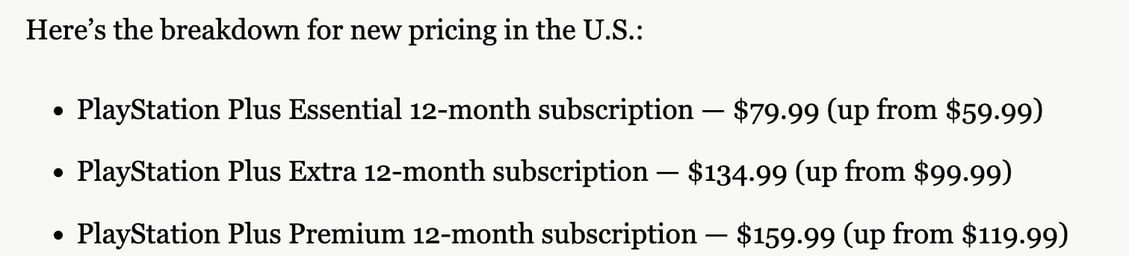 These are the new prices for all Playstation Plus subscriptions services and they are live RIGHT NOW! Just to put that into a monthly perspective, Playstation Plus Essential had a 33% increase ($6.66/month), Playstation Plus Extra had a 35% increase ($11.25/month), and Playstation Plus Premium also had a 33% increase ($13.33/month).
